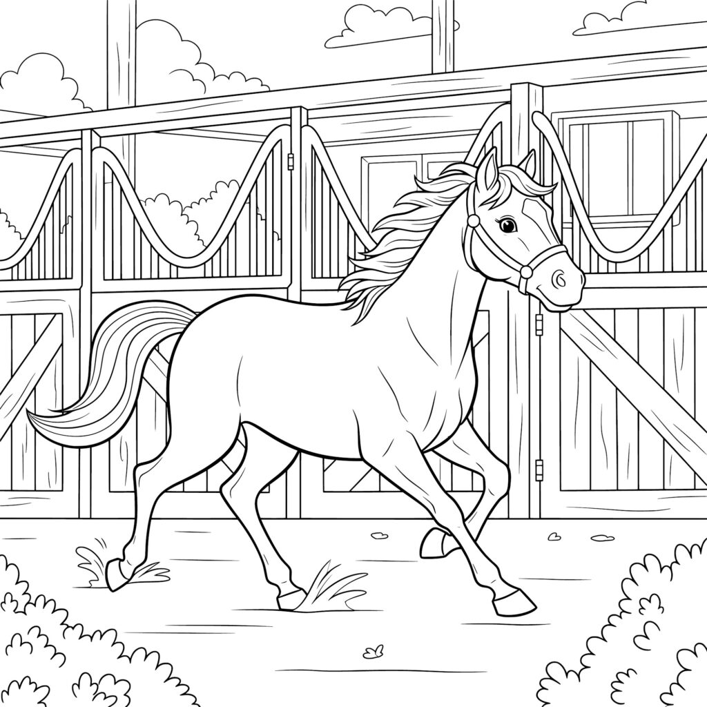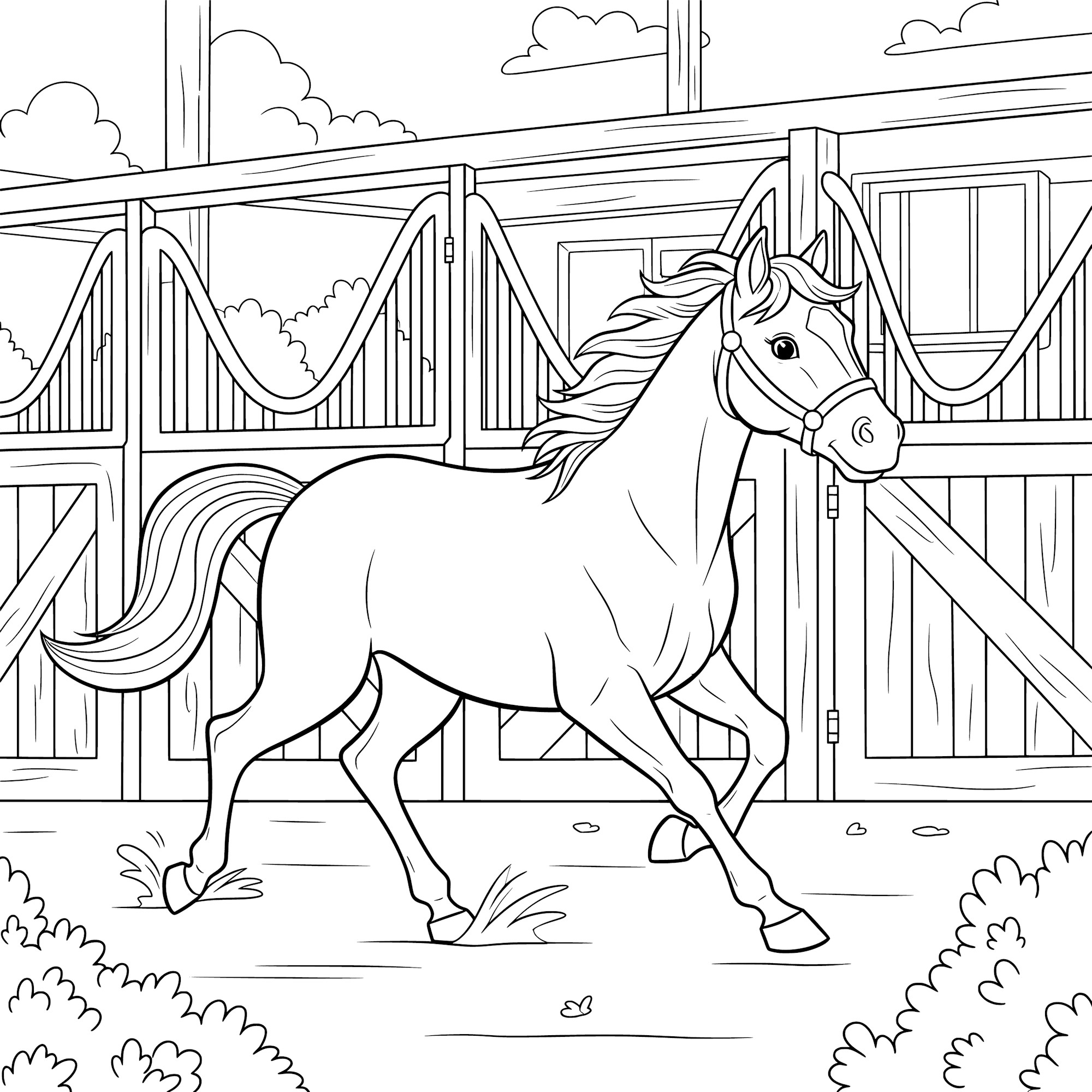 - Dynamic action shots of charming cartoon horses running freely in front of stables