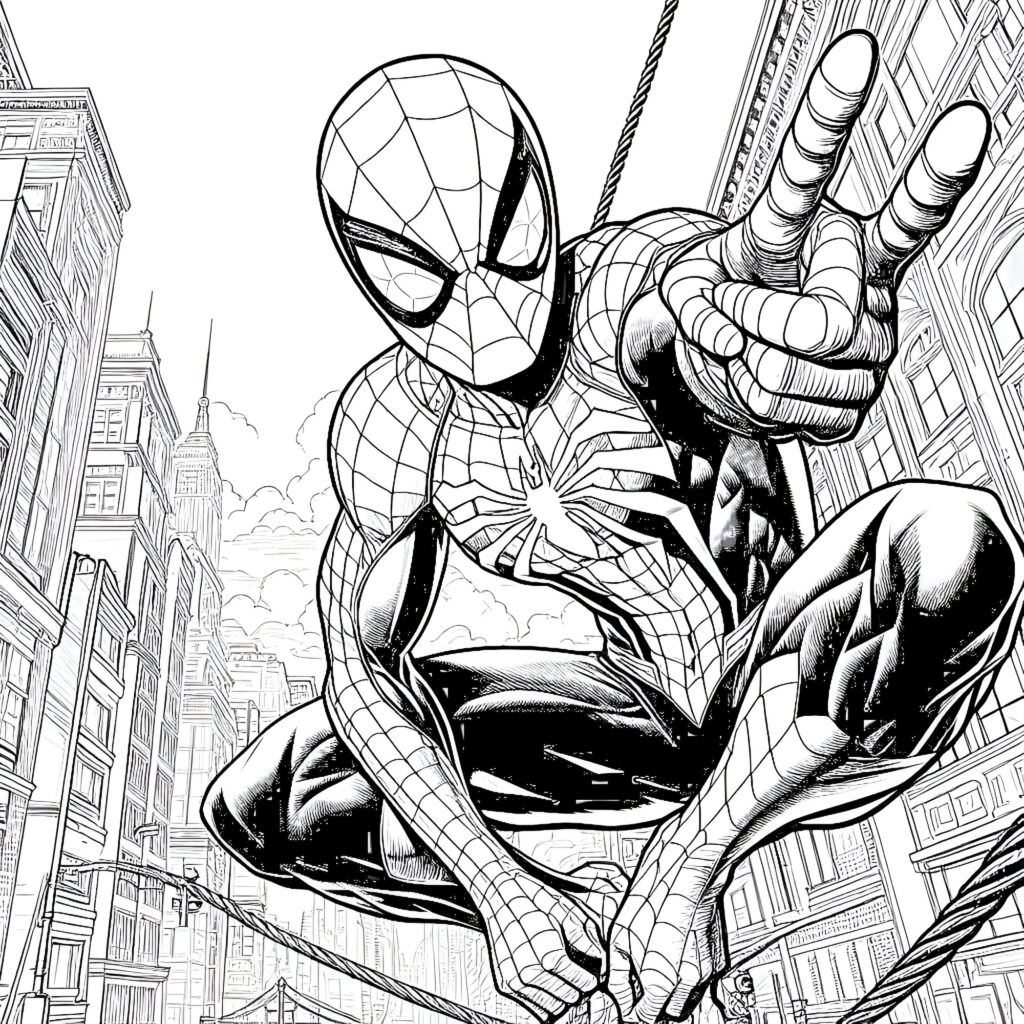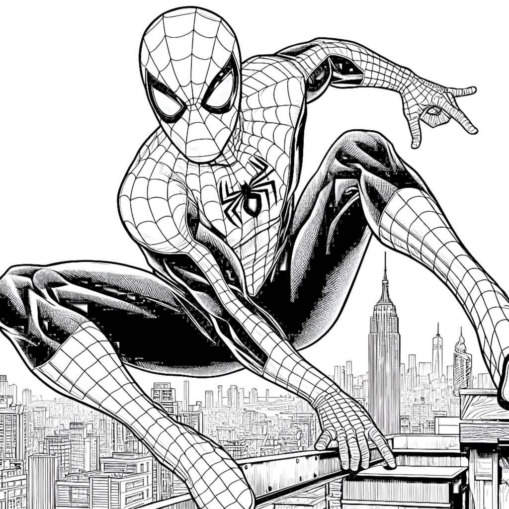 Each illustration showcases Spiderman in his natural habitat—the towering skyscrapers and bustling streets of New York City. From web-swinging between Manhattan’s iconic buildings to perching atop the Chrysler Building, these scenes capture the urban landscape that makes Spiderman’s story so compelling. The detailed backgrounds include recognizable NYC landmarks, allowing you to explore the geography that shaped our friendly neighborhood superhero.