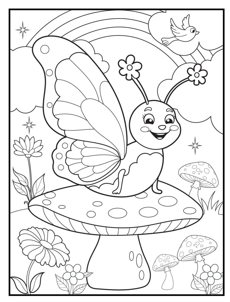 Butterfly on a mushroom coloring page for kids | Laky Creative