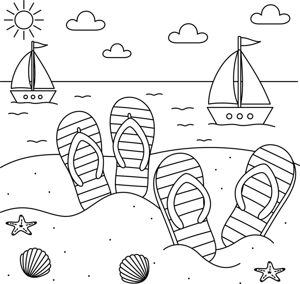 Cute colorful flip-flops scattered on sandy shores cartoon coloring page. Summer coloring page for kids | sala68