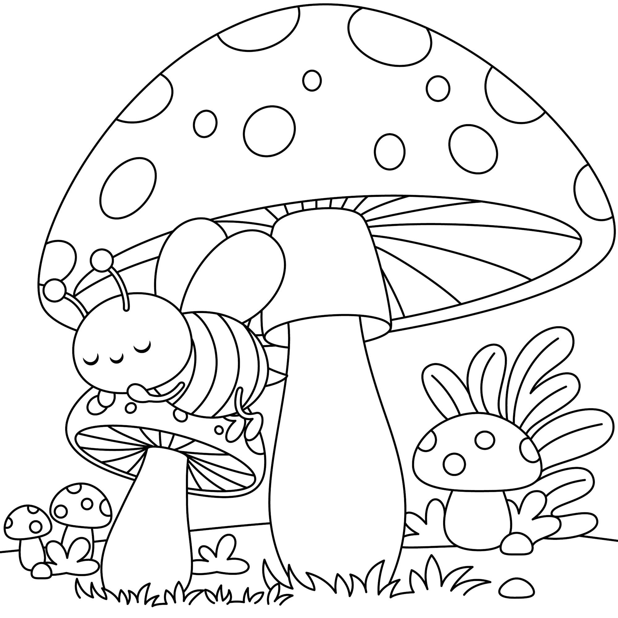 Cute kawaii bee sleeping on the mushroom coloring page for kids | sala68