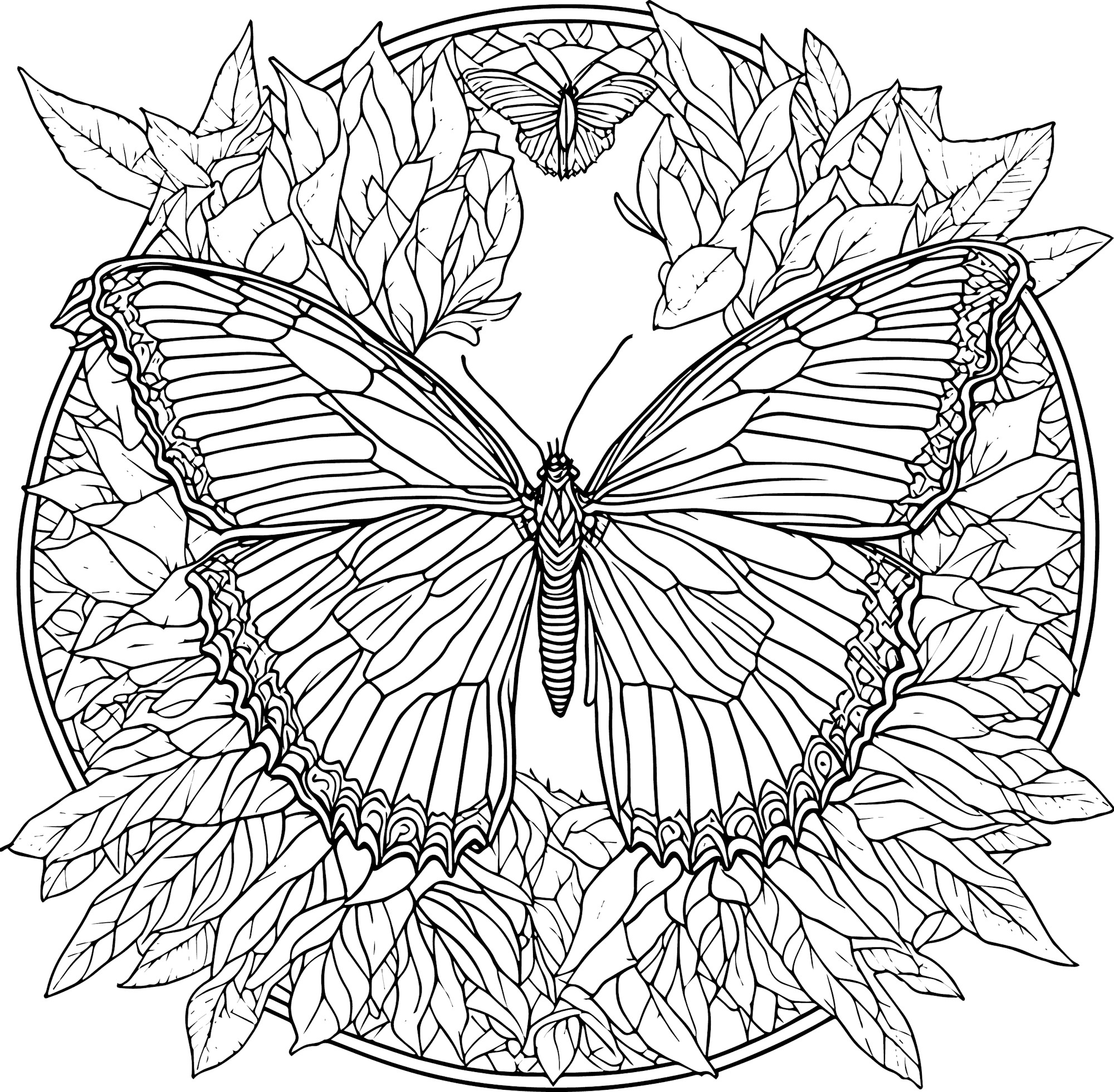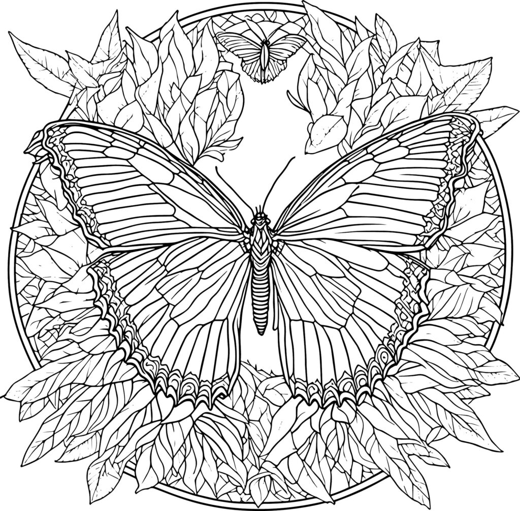 • Intricate butterfly with floral mandala line art for advanced colorists
