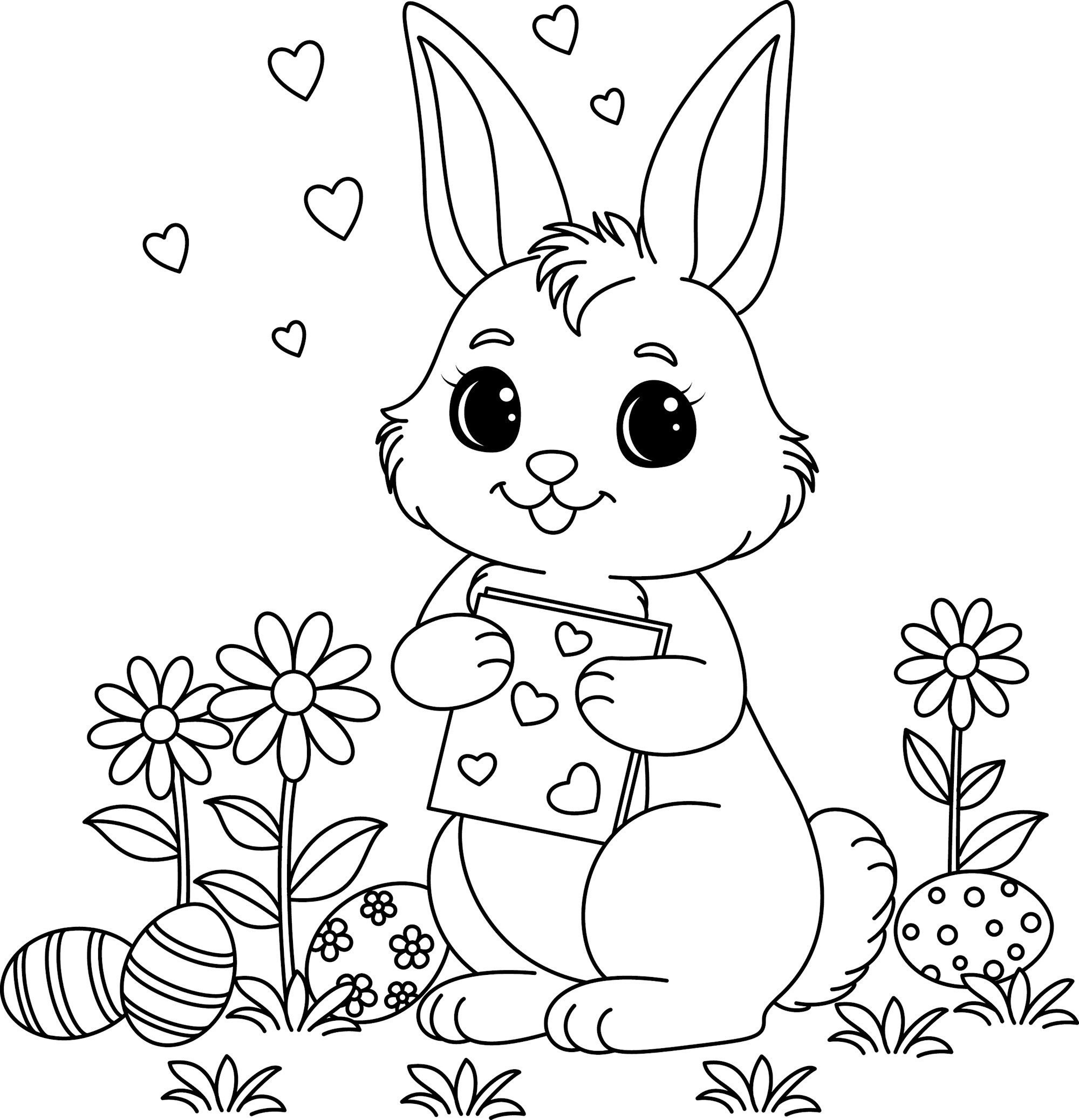 Step into a world where cute kawaii bunnies hug decorated Easter eggs against blooming flower backgrounds, where newly hatched chicks explore enchanted gardens, and where Easter baskets overflow with painted treasures tied with beautiful bows. Each page tells its own story – from bunnies waving cheerful “Happy Easter” greetings to garden scenes bursting with springtime magic.